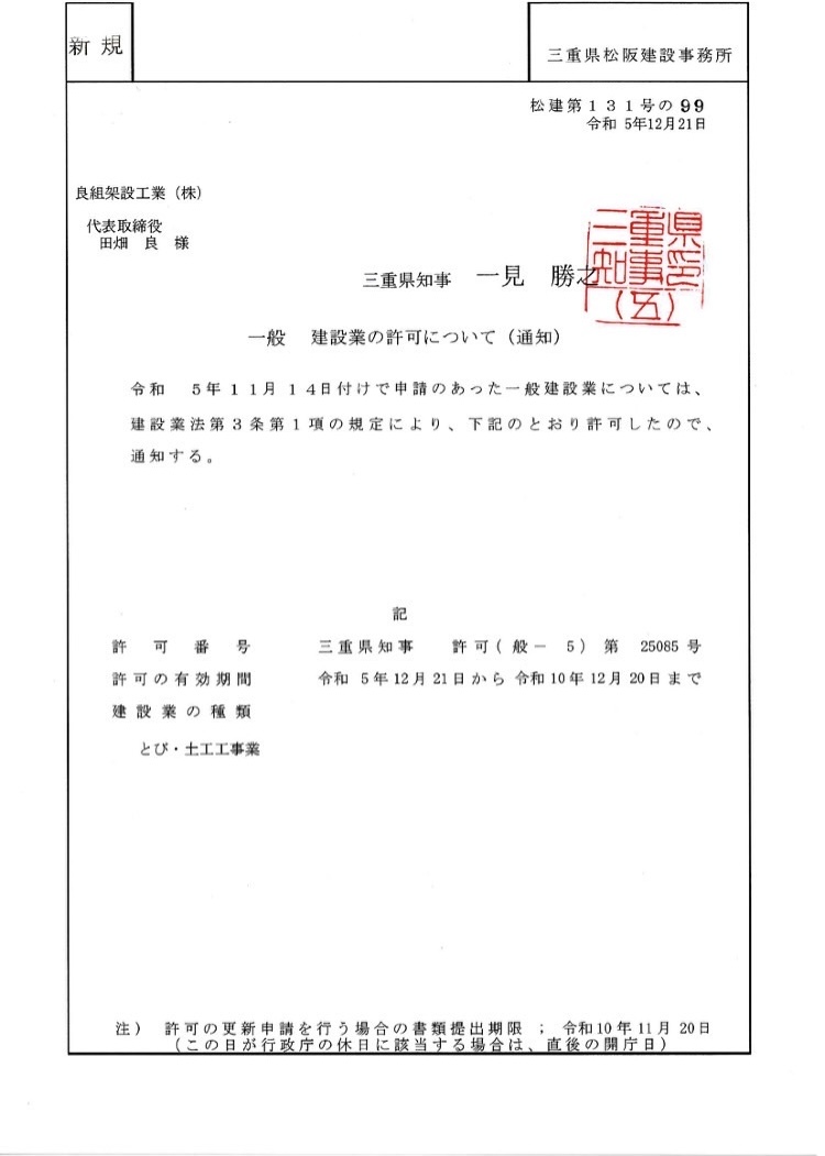 三重から日本全国へ 確かな技術と実績で未来の架け橋を築く 良組架設工業株式会社 弊社の施工内容 弊社の強み 安全第一・経験豊富な職人・全国対応 橋梁架設、吊足場の仮設なら良組架設工業株式会社(ヨシグミカセツコウギョウ)にお任せください。安全・確実・誠実”をモットーに社会インフラを支える仕事を続けています。 会社概要 会社概要 良組架設工業株式会社 代表者名 田畑 良 本社所在地 📍三重県多気郡明和町大字明星1587-12 📱0596-64-8801 ✉️ info@yoshigumi-kasetsukogyo.com ✉️ ryotabata0319@outlook.jp 建設業許可証 良組架設工業株式会社は、橋梁架設工事や吊足場仮設を専門とする建設会社です。確かな技術と実績で、安全・効率的な施工を提供し、地域インフラの発展に貢献しています。 イメージ動画を見る 弊社の施工内容 Industries We Serve! 橋梁架設工事(新設・補修など) 私たち良組架設工業株式会社は、数多くの橋梁架設工事を手がけてきた確かな実績と経験をもとに、新設工事から補修・補強工事まで幅広く対応しております。河川や道路、鉄道上における橋梁架設は、地形・気象・交通条件などの制約が多く、高度な計画力と施工管理が求められます。当社では、長年のノウハウと熟練の技術により、安全かつ効率的な架設を実現し、地域インフラの維持・発展に貢献しています。また、老朽化した橋梁の補修・耐震補強工事にも積極的に取り組んでおり、現場ごとに最適な施工方法を提案・実施しております。主な対応内容:鋼橋の新設工事老朽橋梁の補修・補強・架け替え安全第一をモットーに、確実な施工で社会の信頼に応える橋づくりを行っています。 吊足場仮設(河川・高架下・特殊地形対応など) 良組架設工業株式会社では、高所や足場の確保が難しい現場において、安全かつ効率的に作業環境を提供する吊足場の仮設工事を承っております。橋梁の裏面や高架下、急傾斜地、河川上など、従来の足場では対応が困難な場所にも、当社の豊富な経験と専門技術により柔軟に対応可能です。設計から施工まで一貫して対応することで、安全性と作業性を両立させた足場環境を構築いたします。仮設工事は「作業員の命を預かる仕事」であるとの責任感のもと、すべての工程において細心の注意を払っております。対応可能な現場例:橋梁の下面点検・補修工事用吊足場高架道路下部の作業用仮設構造河川上・渓谷部などの特殊地形工場・プラント内の高所設備まわり設計から施工、解体に至るまで、一つひとつの現場条件に合わせた最適な吊足場をご提供いたします。 良組イメージビデオ Our Image Video 良組 プロモーション動画 Special Thanks EBISE Co.,Ltd LEPO 橋梁架設、吊足場の仮設なら良組架設工業株式会社(ヨシグミカセツコウギョウ)にお任せください。求人に関してもお気軽にお問い合わせください。 お問い合わせ